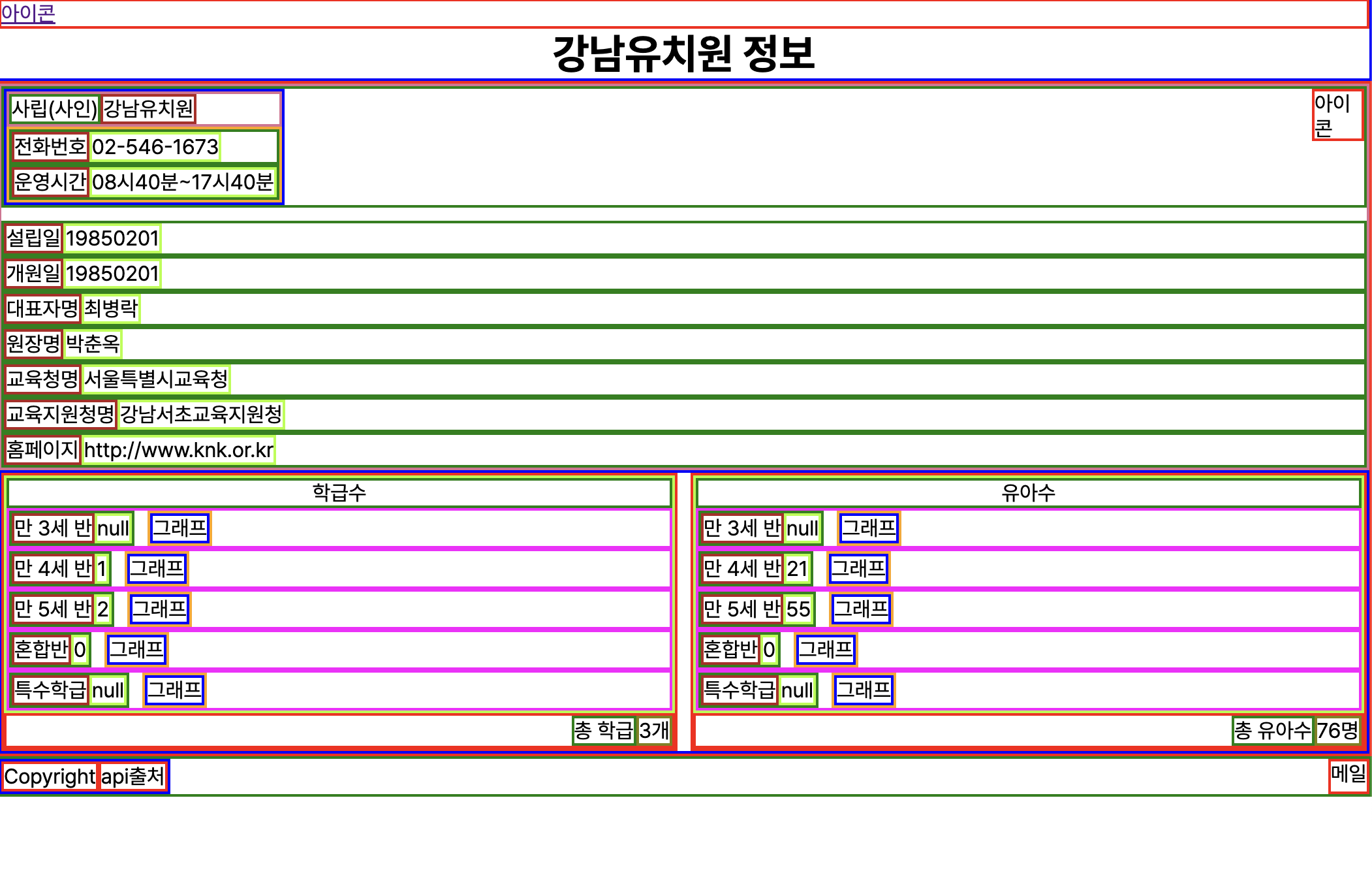 이렇게 하면 가져오는 유치원 디테일 정보에 대한 변수인 kinderInfos가 하나일 때는 문제없이 페이지 구성이 가능했다. 문제는 kinderInfos 배열이 2개 이상일 때였다. 예를들어 강서구 버튼을 누르고 디테일 페이지까지 들어왔는데 같은 유치원 이름을 가진 0번 배열 송파구 유치원 디테일페이지에 표현되었다. 구에 대한 정보와 관련 없이 유치원 명으로만 검색된 정보였기 때문이다.