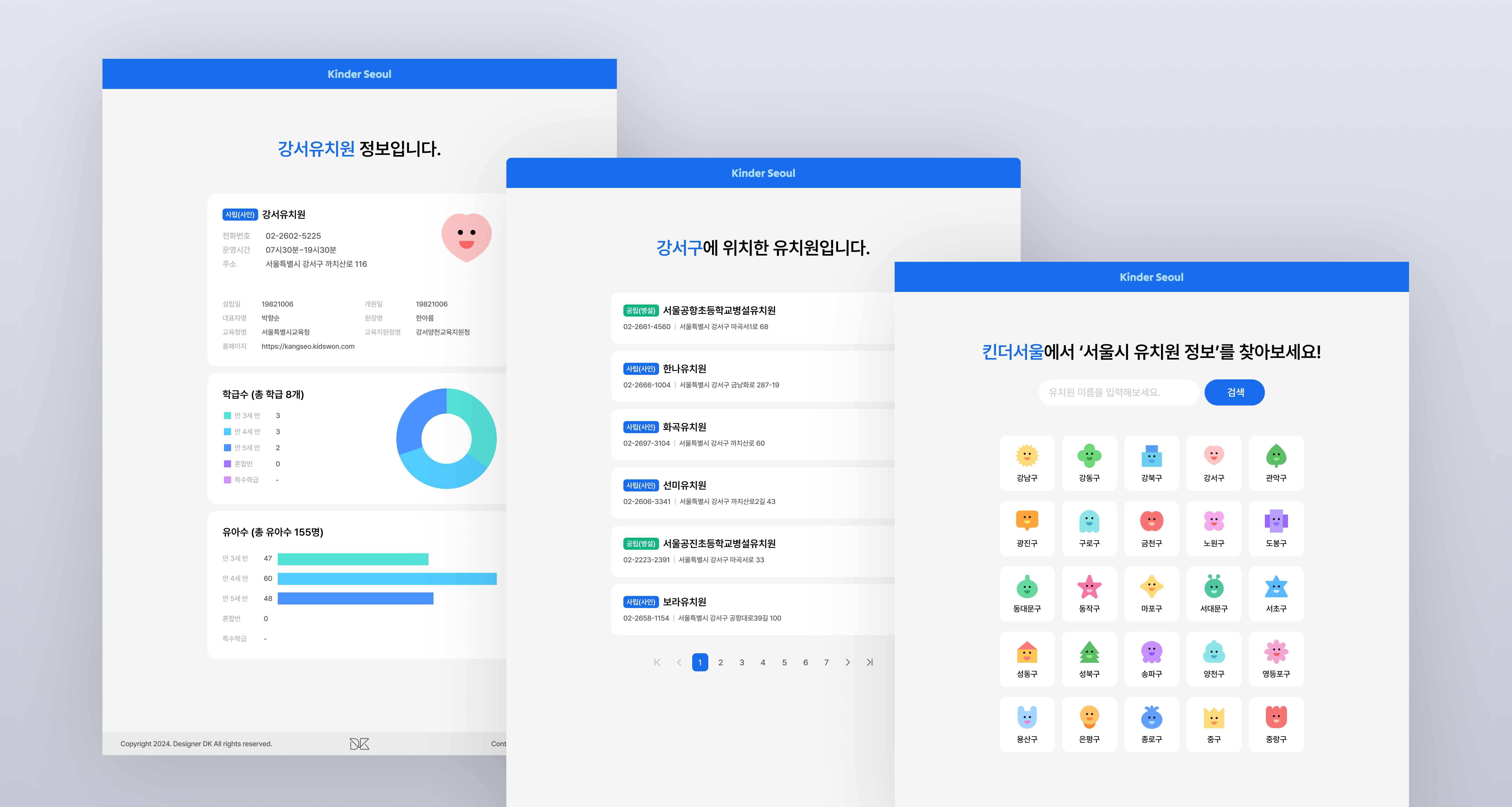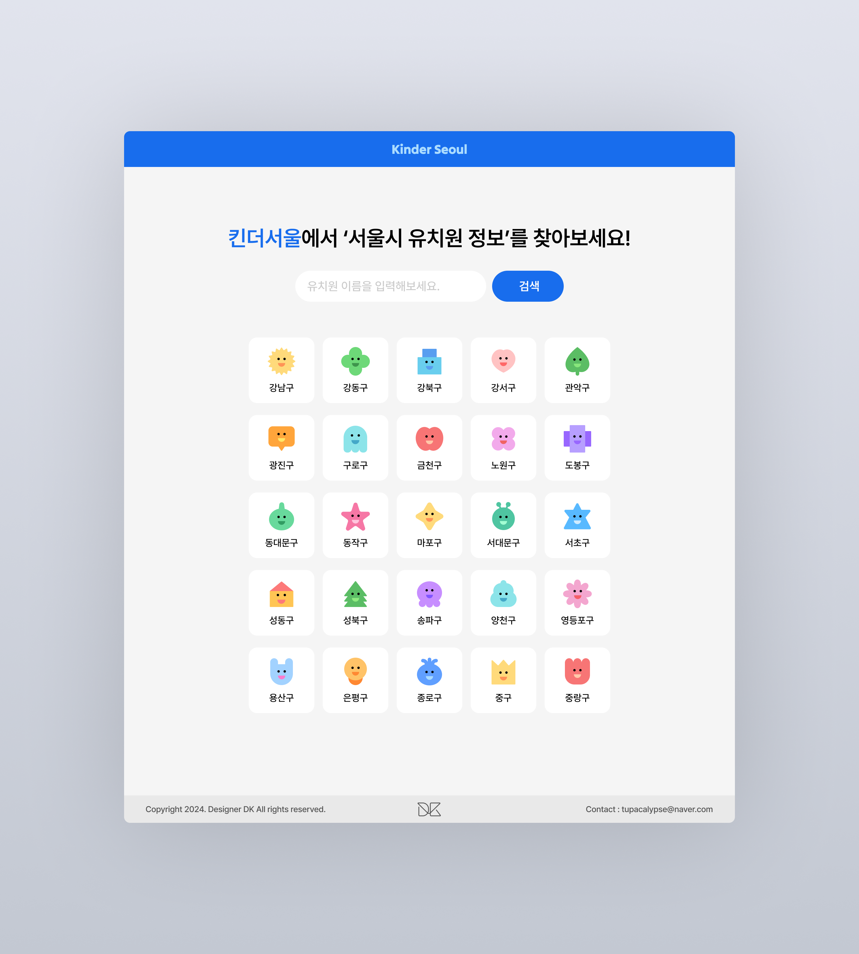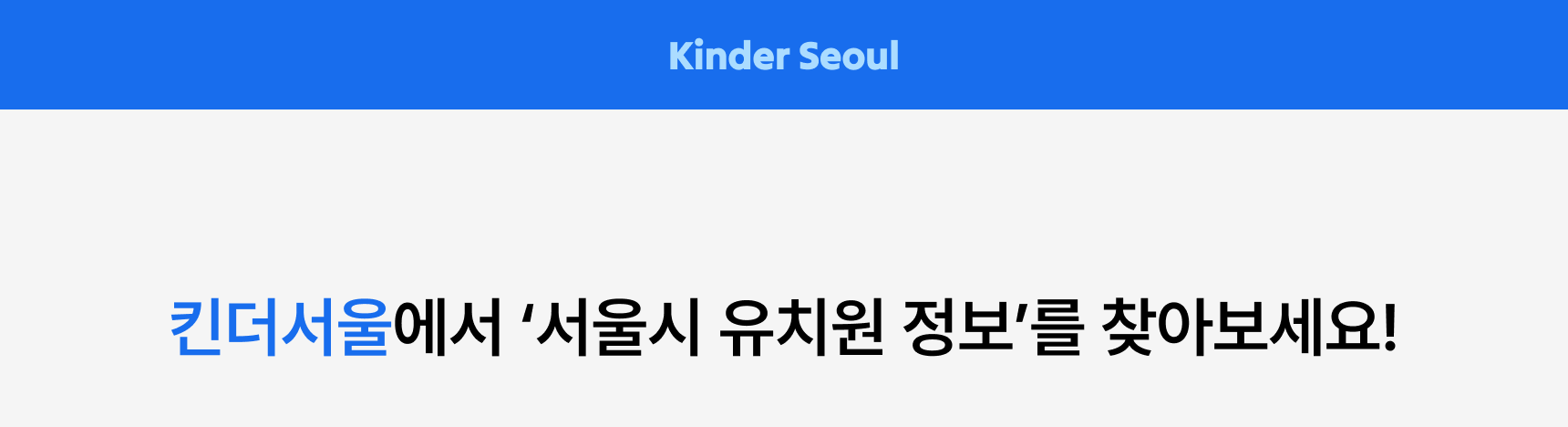 프로젝트성 사이트이긴 하지만 나름의 브랜딩은 필요하다고 생각되어서 사이트 이름도 지어보았다. 서울시 유치원 정보를 보여주는 사이트이니까 ‘킨더서울(Kinder Seoul)’이라는 이름으로 지었다.