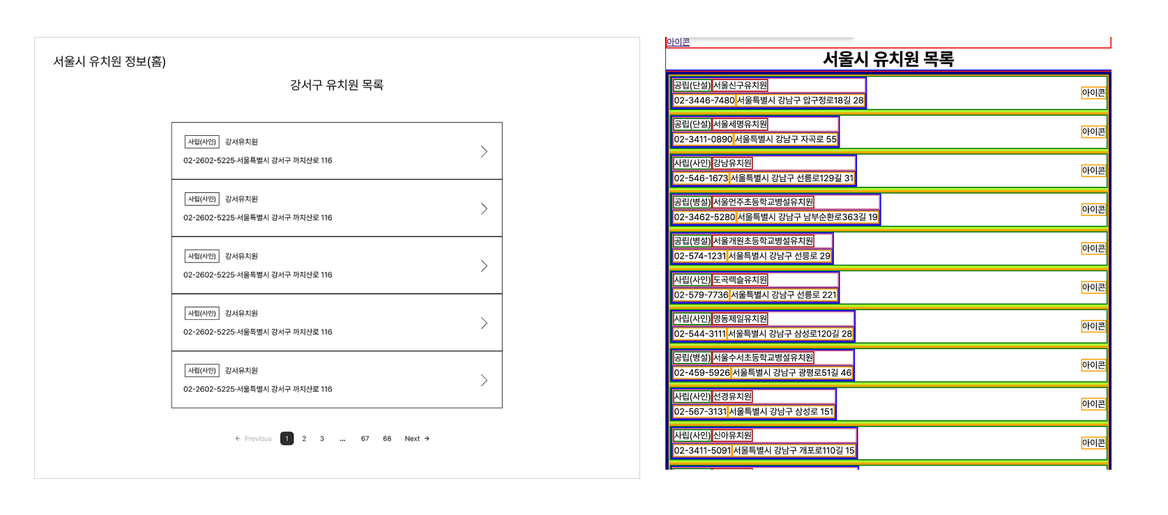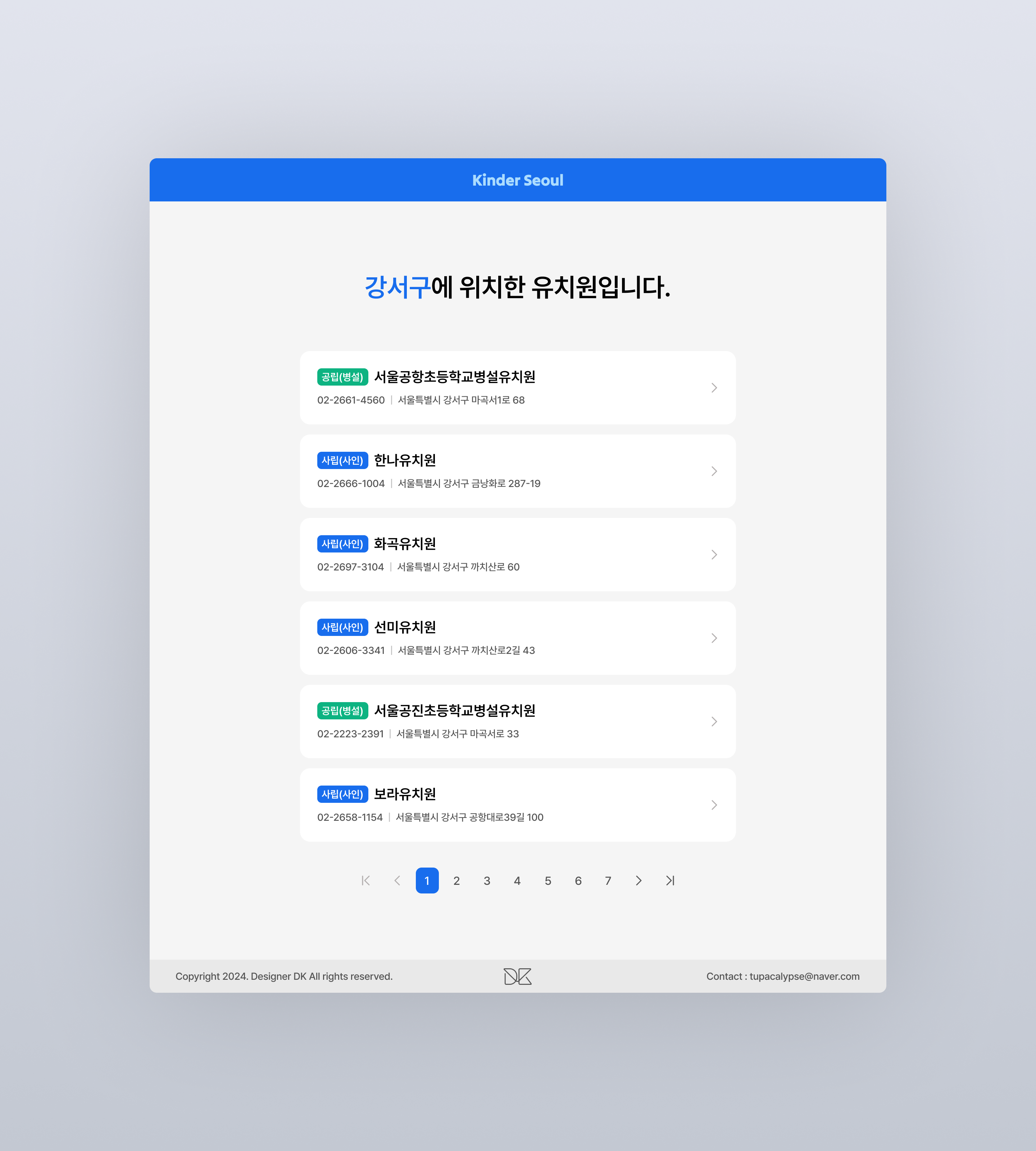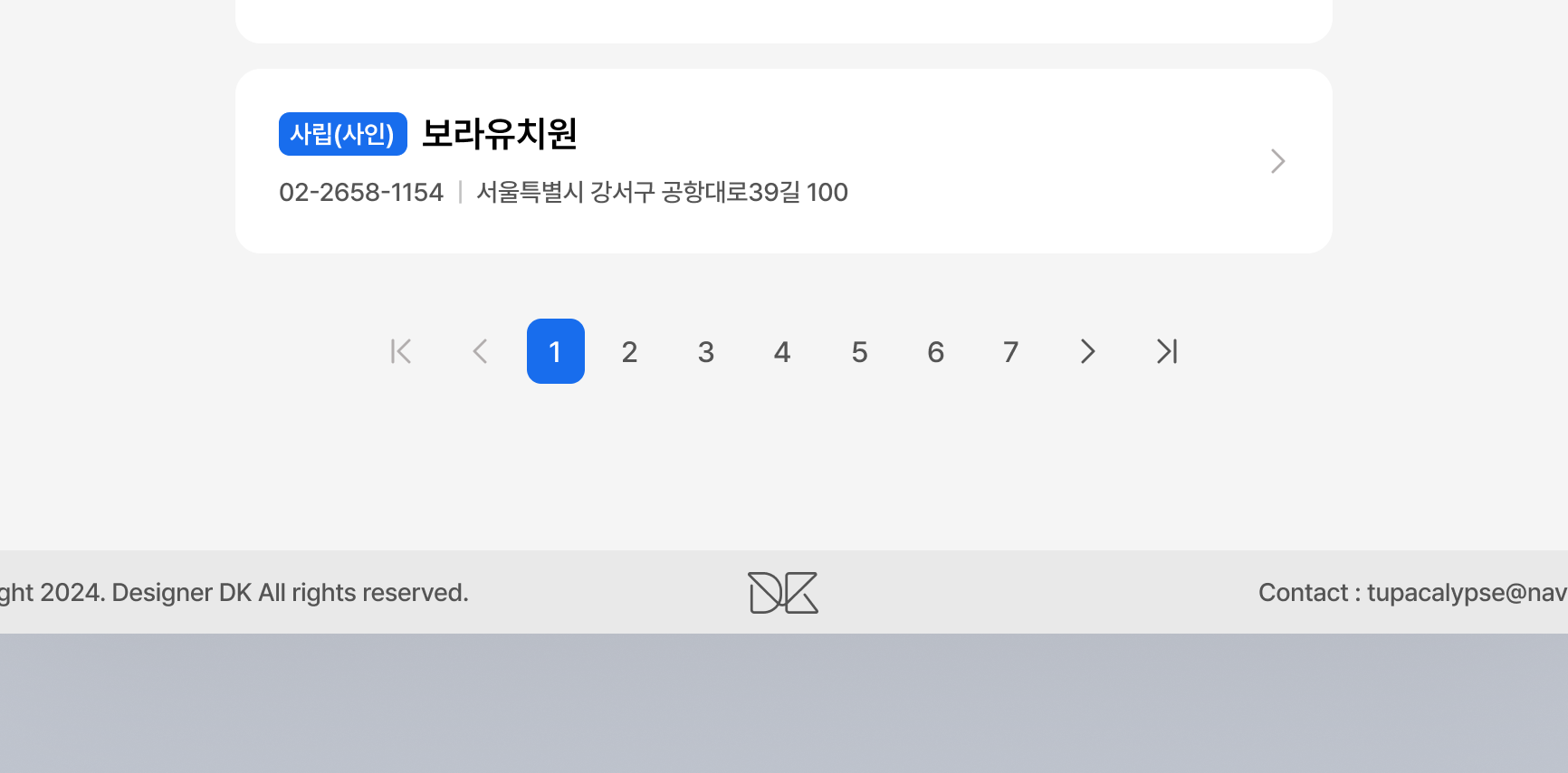 유치원 목록 페이지는 구버튼 혹은 직접 검색으로 서치한 유치원들의 목록을 보여주는 페이지로써 간단한 필수 유치원 정보인 유치원 이름, 주소, 전화번호를 담은 카드 디자인 컴포넌트로 채워져있다.