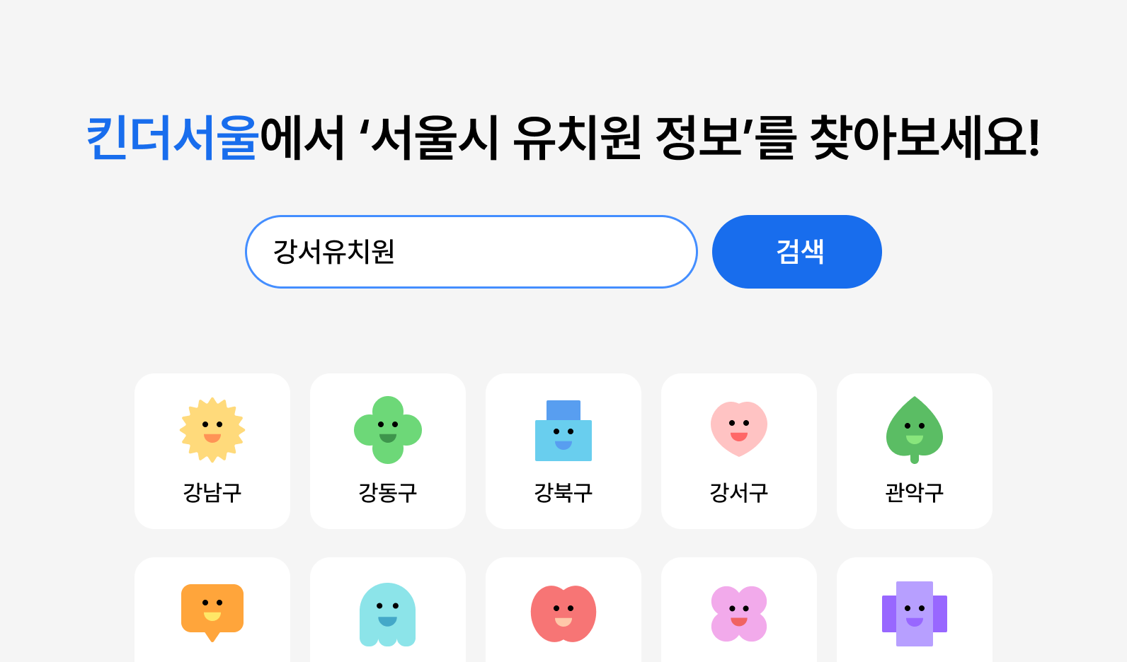 홈 화면에서 유저는 두가지 액션을 할 수 있는데 서울시 25개 구 버튼을 통해 열람하고 싶은 유치원이 속한 구를 선택해서 목록 페이지로 이동할 수 있고, 다른 방법으로는 직접 검색창 검색을 통해서 목록 페이지로 이동할 수 있게 만들었다.