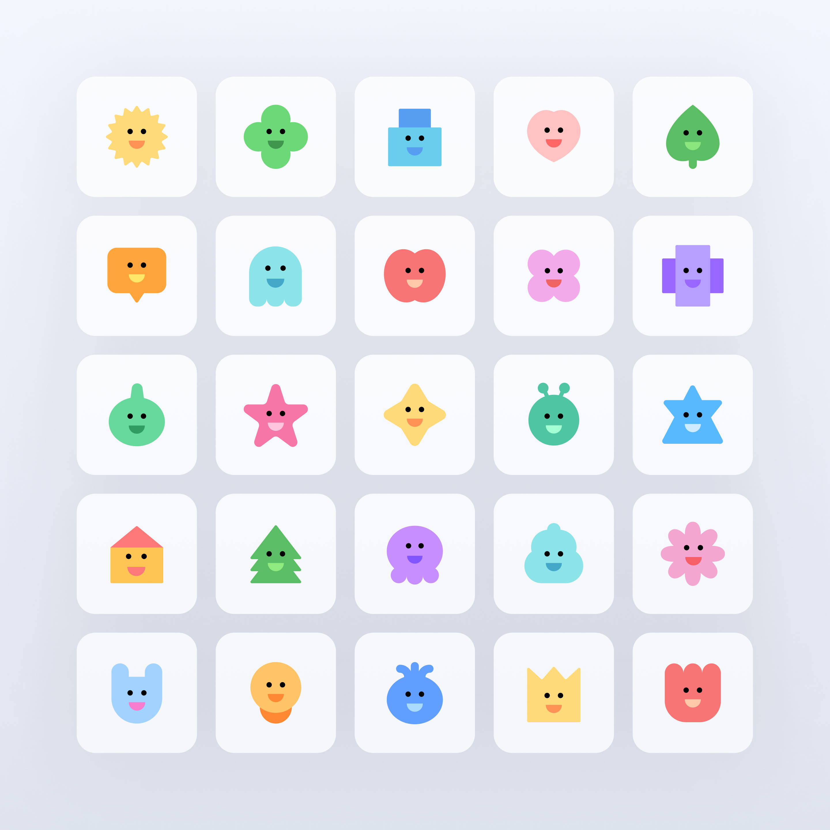 25개 구 버튼의 경우 화면에 텍스트 버튼으로 나열해봤을 때 너무 정적이고 지루해보였다. 뭔가 해결책이 없을까 고민해봤을 때 유치원 사이트인 만큼 귀여운 캐릭터같은걸 25개 구마다 매칭시켜주면 사이트의 톤앤매너도 밝아지고 구버튼마다 개성이 생기면서 유저에게 누르는 재미도 줄 수 있겠다고 판단되었다. 그래서 25개의 캐릭터를 디자인해서 각 구버튼마다 이미지로 넣어보았다.