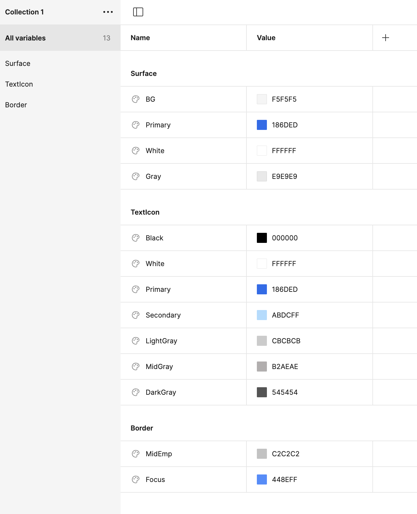 이는 당연히 css에도 똑같이 적용될 것이라 판단해서 피그마와 동일하게 스타일 변수화 작업에 들어갔다. 작업의 혼돈을 줄이기 위해 피그마와 네이밍도 최대한 일치시켰다.