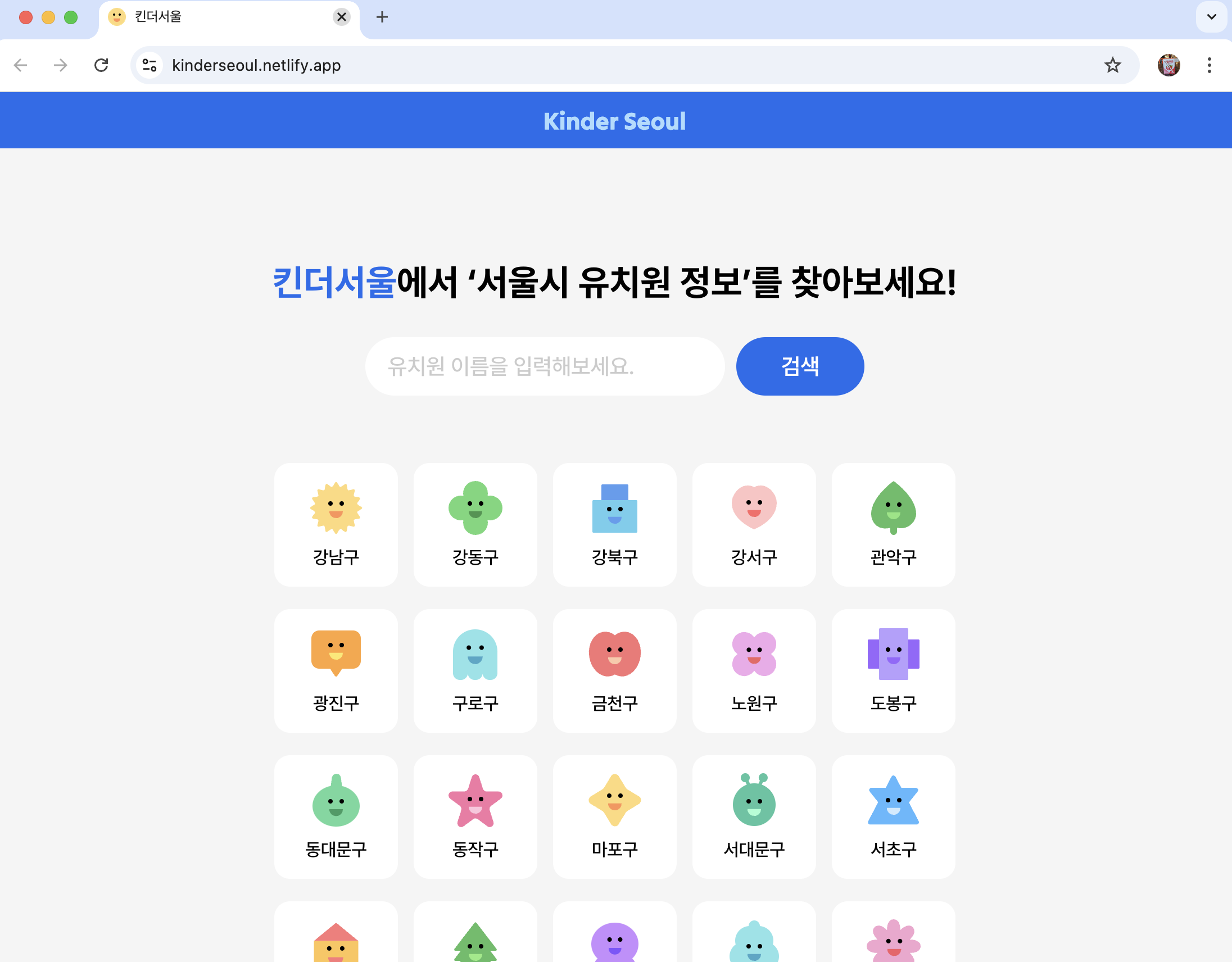 약 두 달 전에 시작한 개인 프로젝트인 ‘킨더서울’ 웹사이트를 드디어 오늘 배포하였다. 아직 몇가지 아쉬운 부분이 있지만 그런 부분들은 일단 배포 후 조금씩 다듬어나가보려고한다.