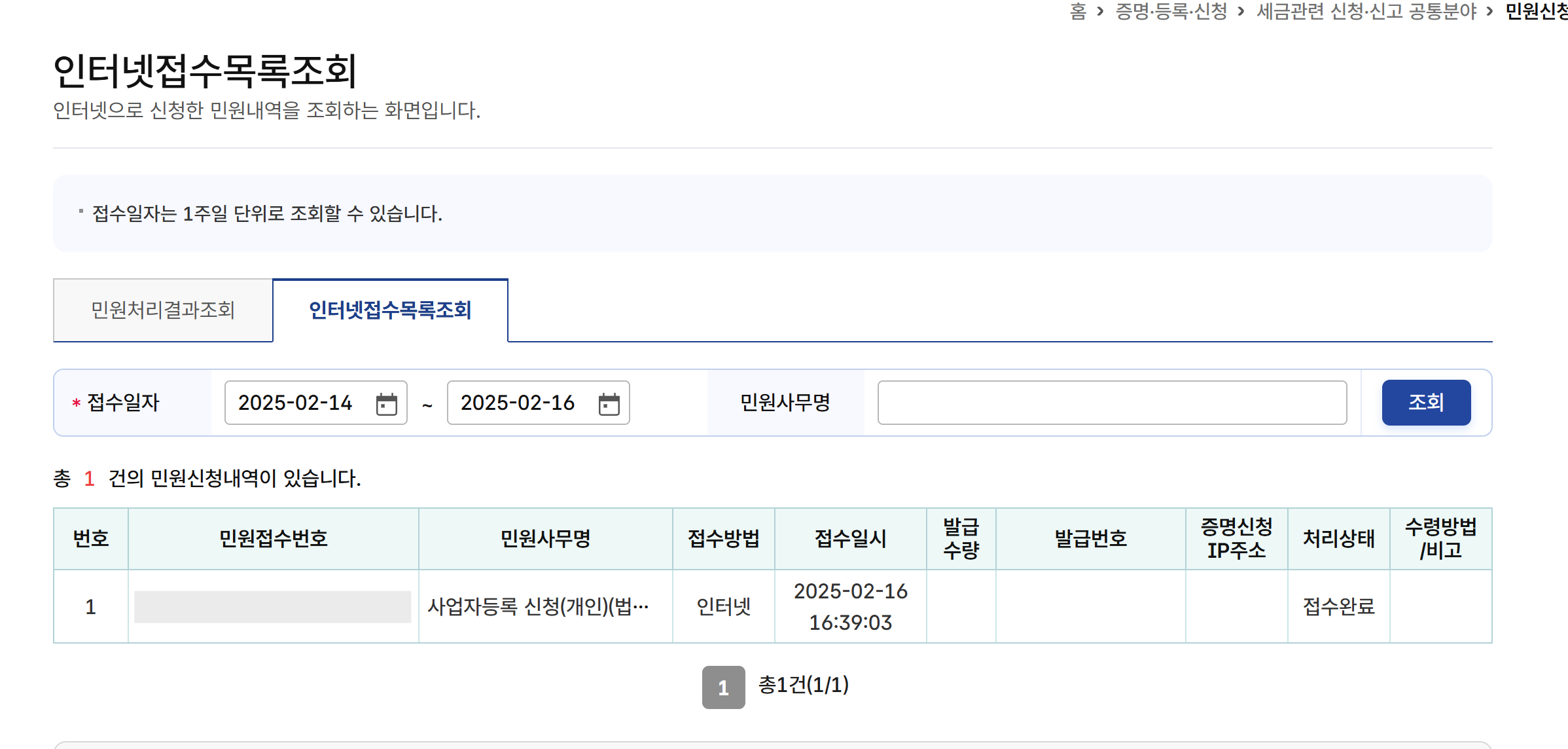 그러면 이런식으로 접수 목록이 뜬다. 이렇게 인생 첫 사업자 등록 신청 완료!
