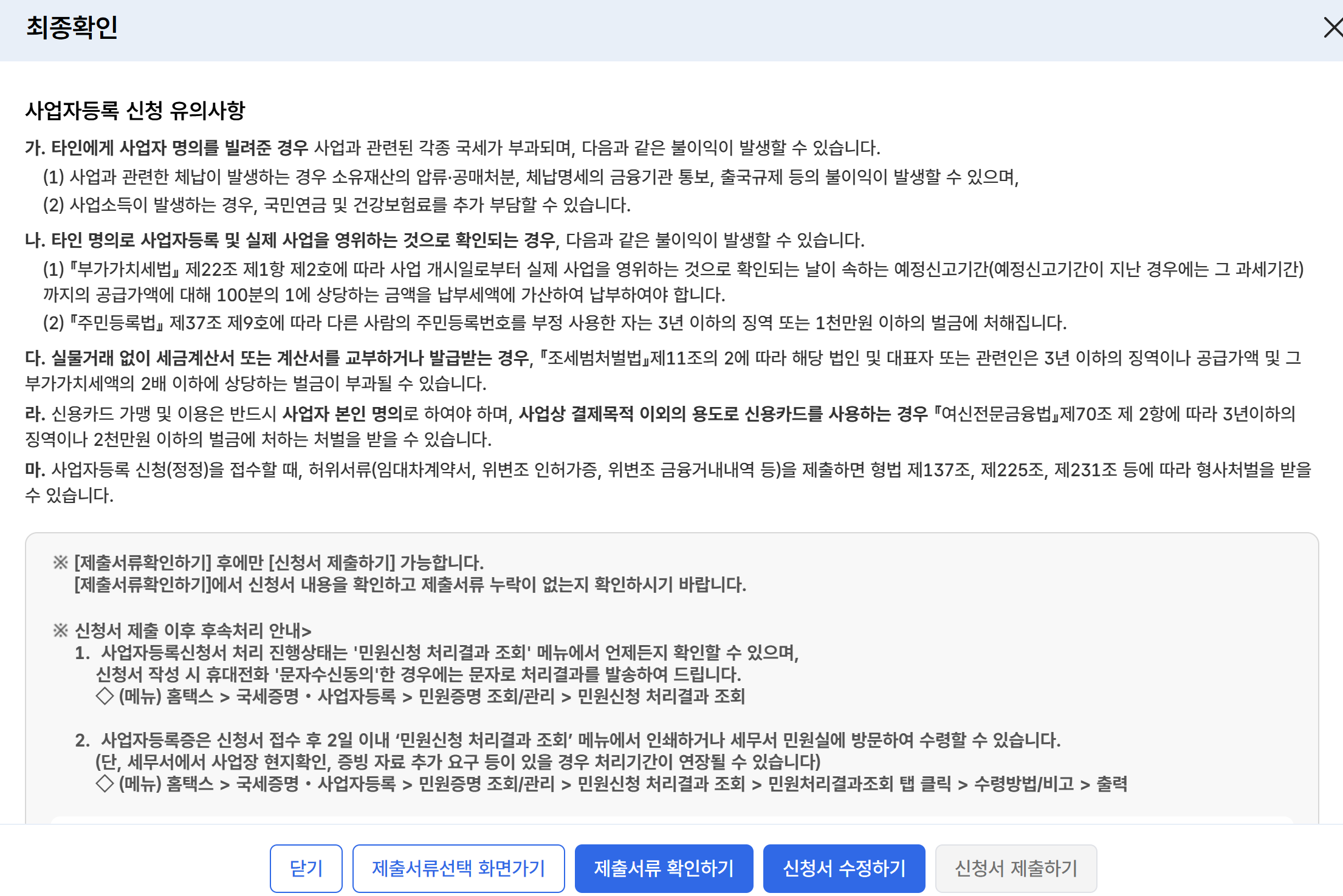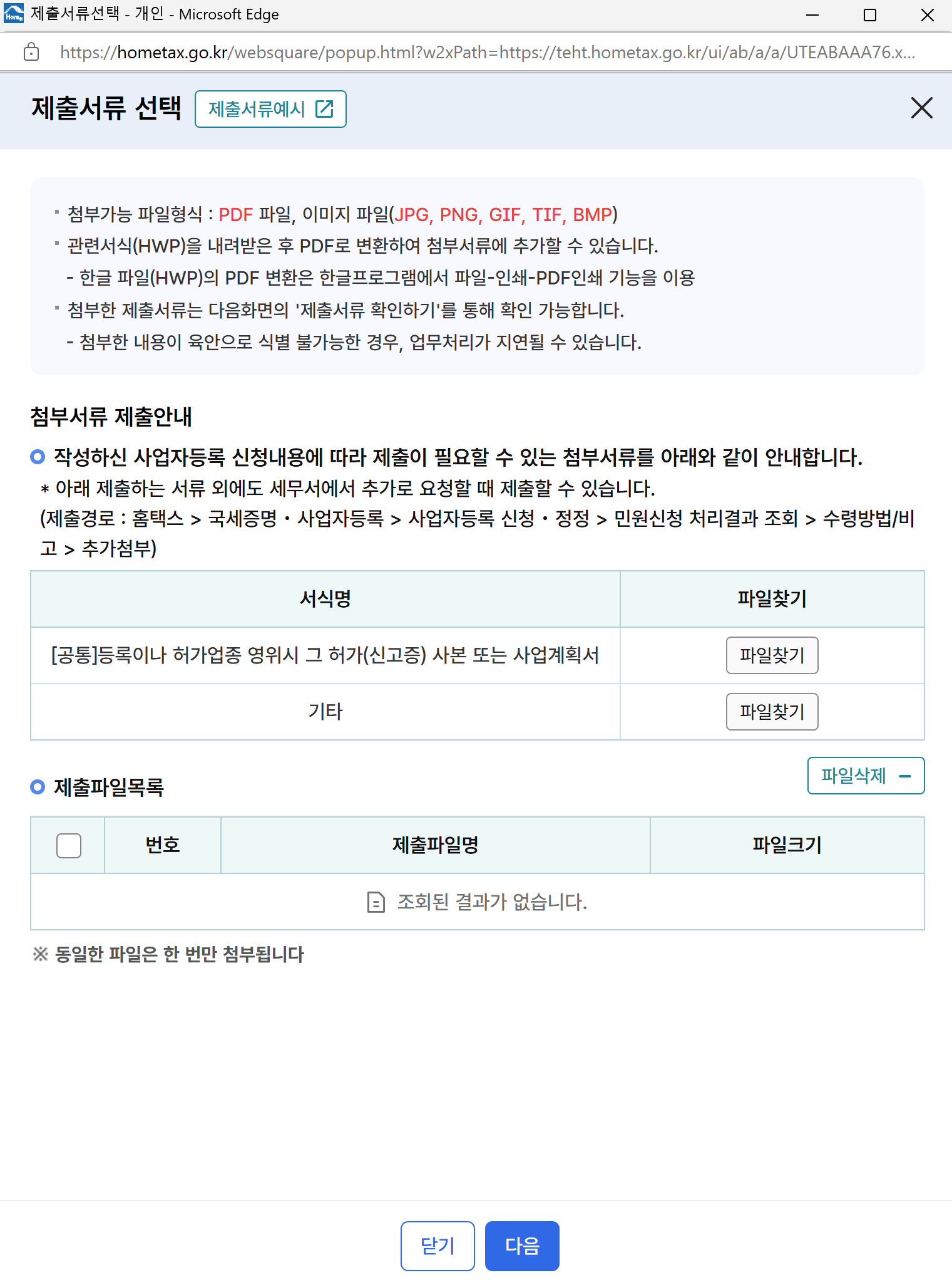 입력한 사업 업종에 따라 사전 제출해야하는 첨부서류가 있다면 여기에 첨부를 하면 된다.