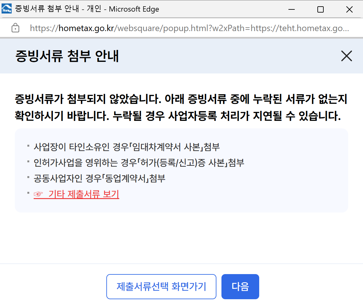 모두 입력하고 다음을 누르면 위 사진과 같은 제출서류 관련 창이 뜬다.