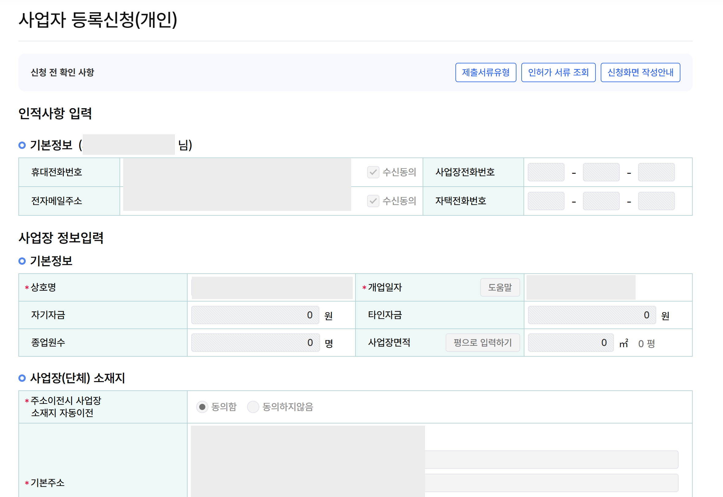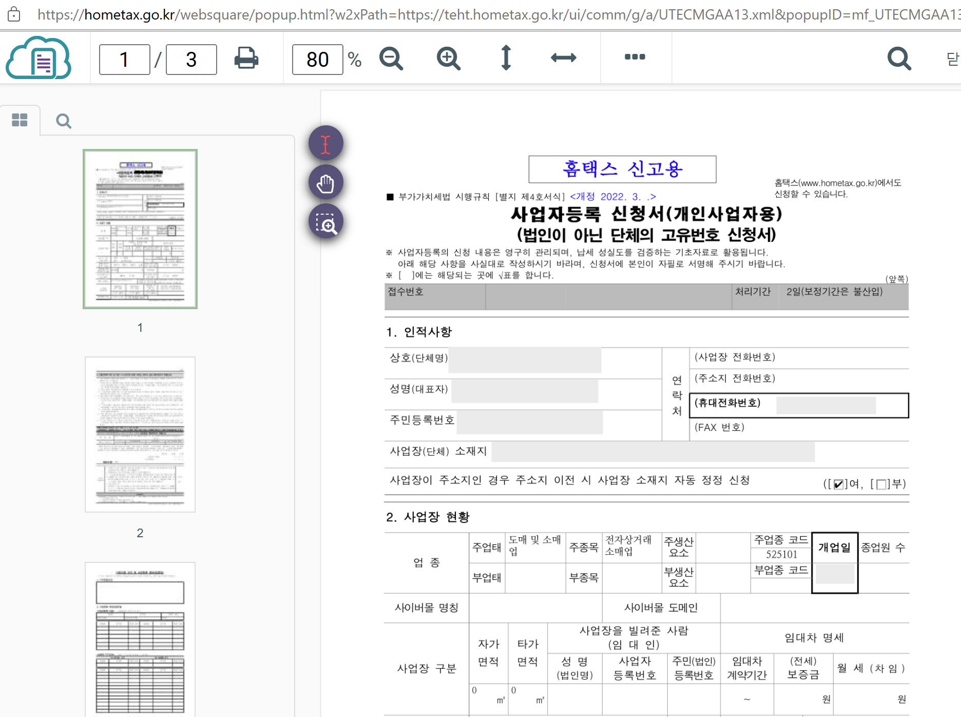 이런식으로 아까 직접 입력한 내용을 베이스로 사업자등록 신청서가 완성되어져 있다.