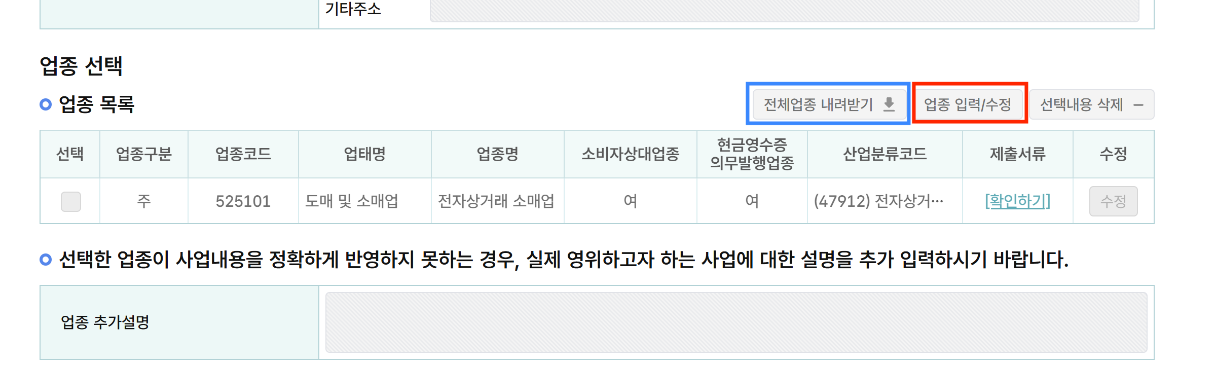 이 페이지에서 미리 잘 살펴보고 입력해야하는 곳이 바로 업종 선택 부분이다.