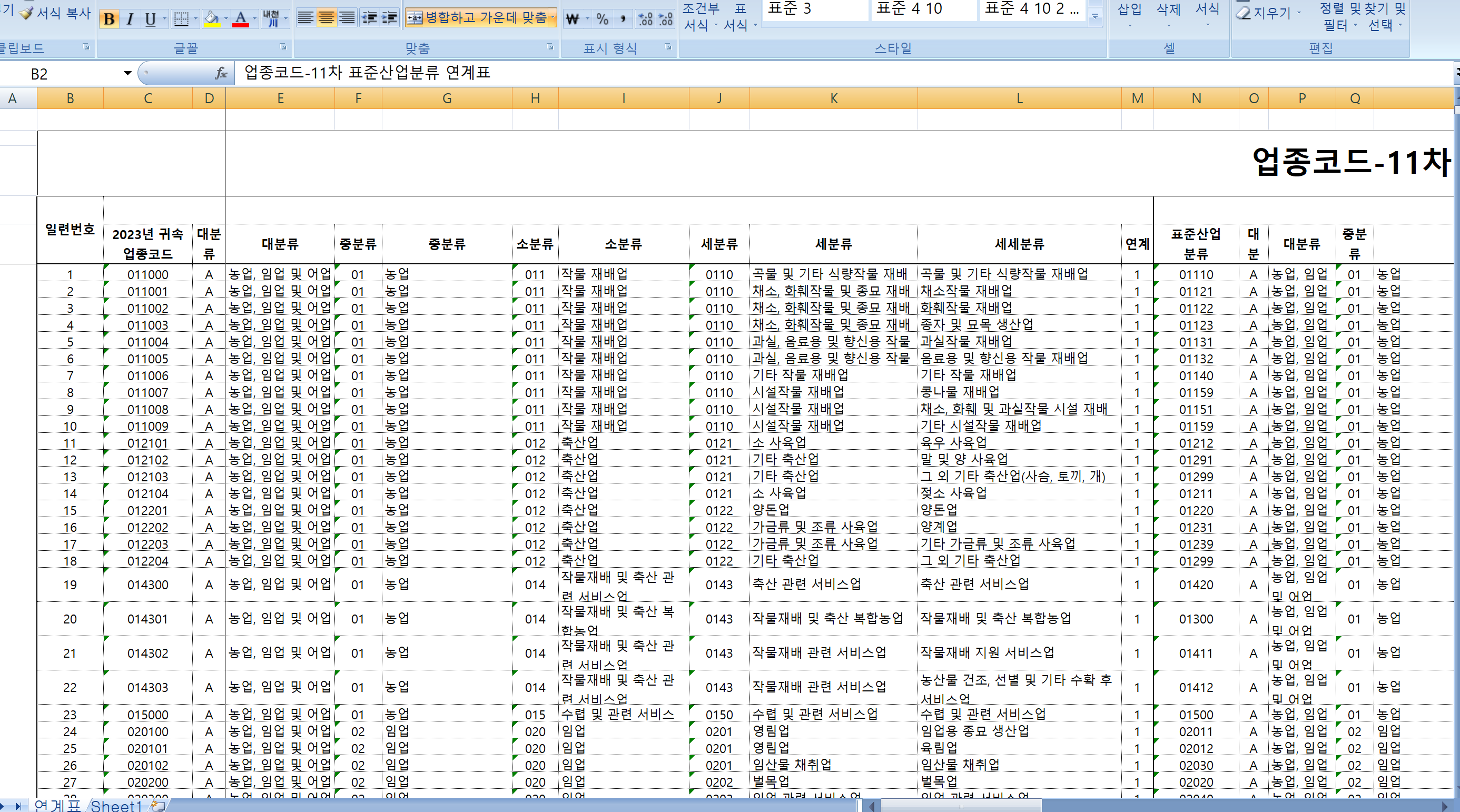 그러면 이런식으로 엄청난 압박의 엑셀파일을 열 수 있는데 우리나라 대부분의 업종이 상세히 기재되어있다.