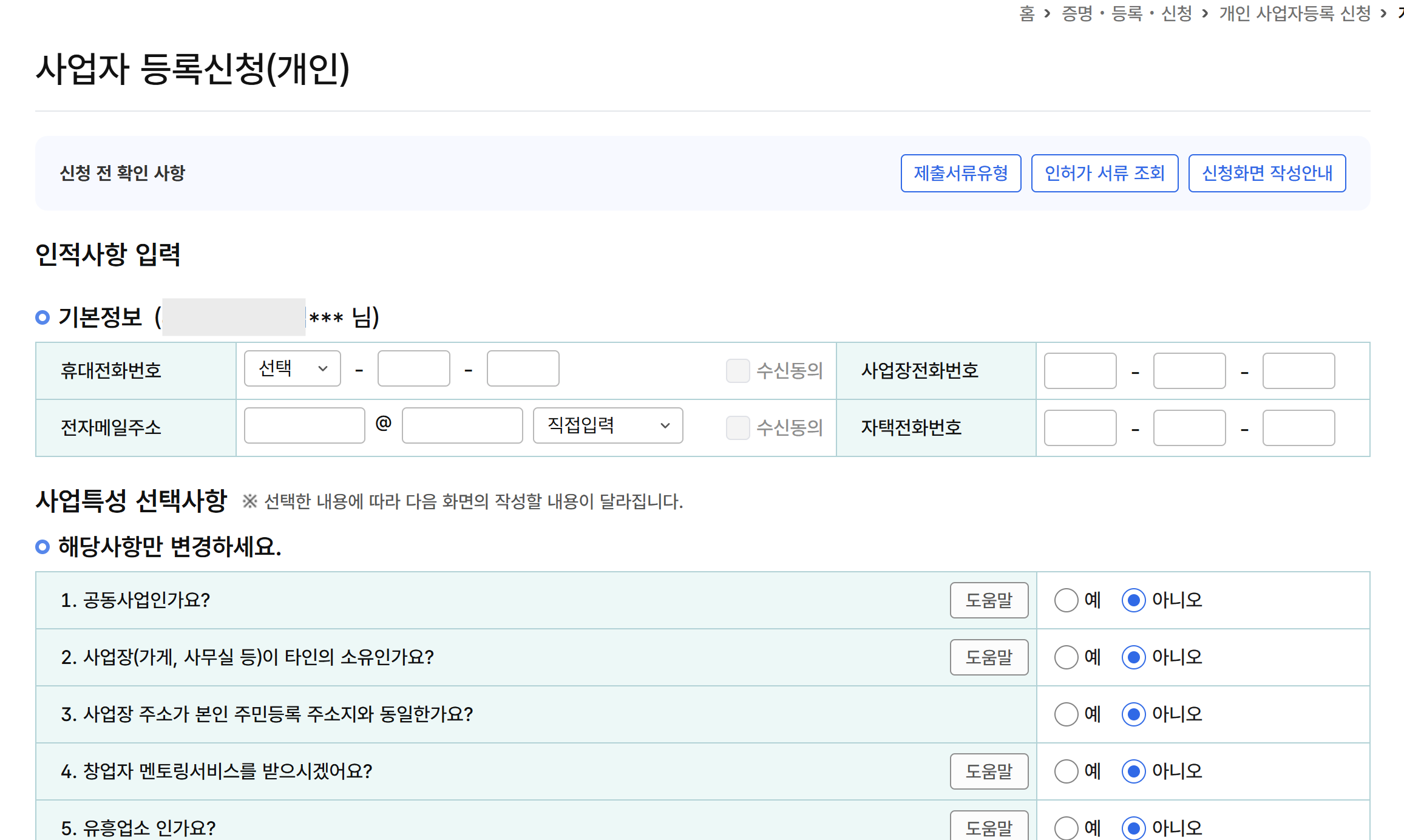 나의 정보와 사업 특성에 따른 선택을 잘 진행해서 다음 페이지로 넘어간다.