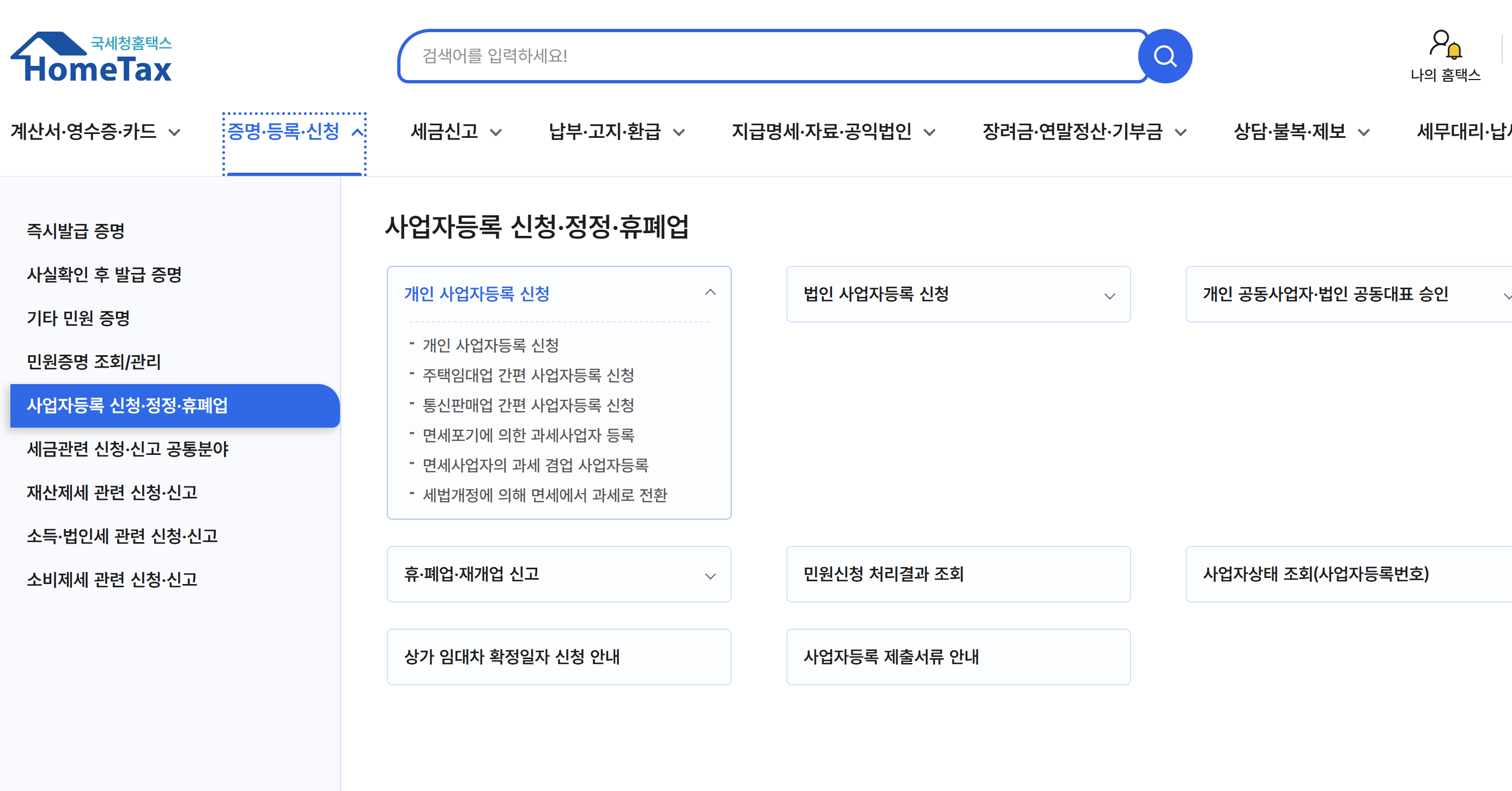 먼저 홈택스에 접속하고 '증명 등록 신청' 탭에서 개인사업자 등록 신청을 찾아서 들어간다.