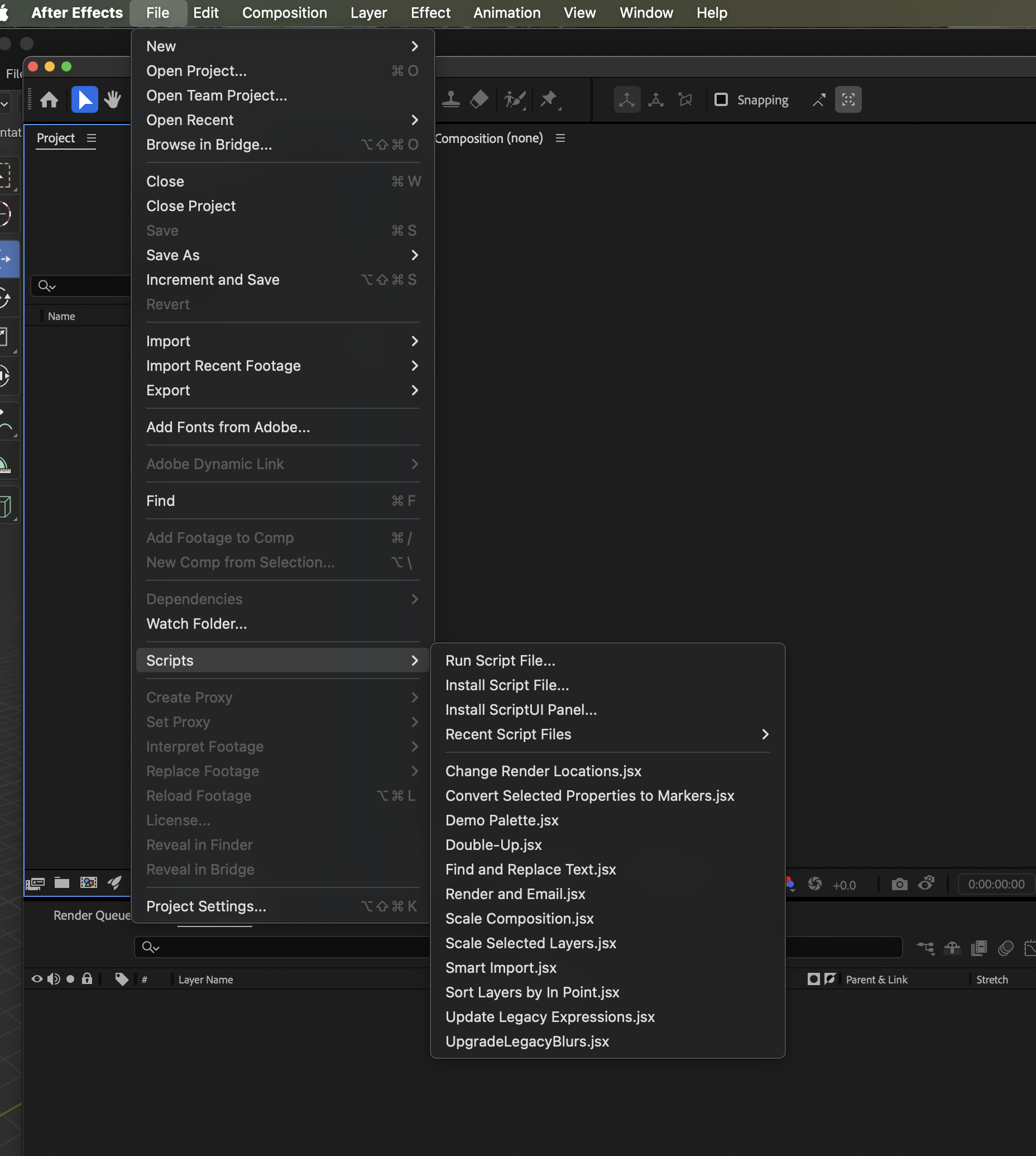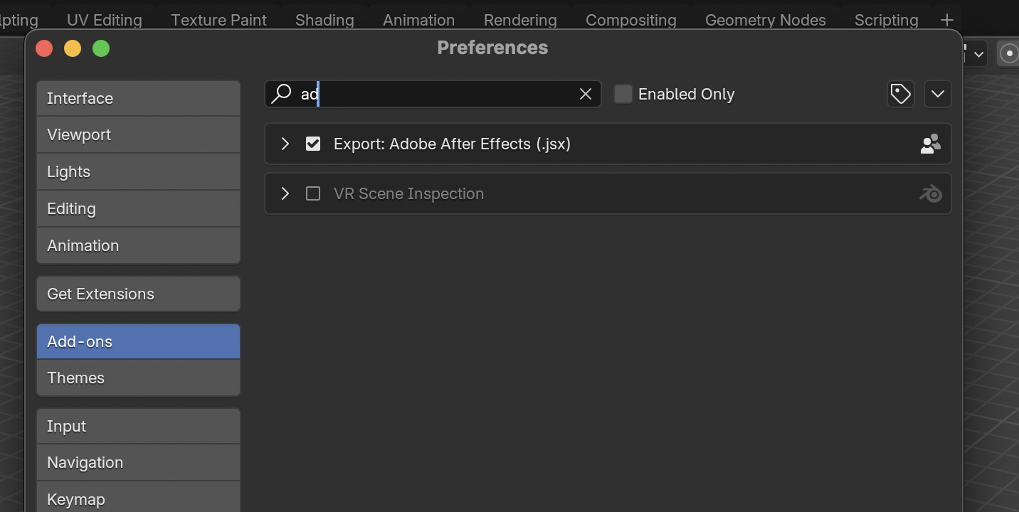 여기서 after effect로 검색하면 export adobe after effects (.jsx) 라는 것이 뜬다. 이걸 클릭