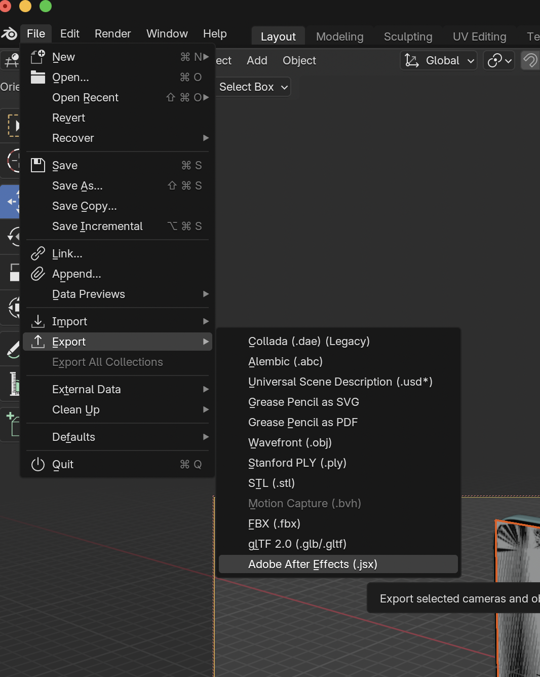 익스포트를 진행해준다. 애드온이 활성화 되었다면 이렇게 애펙 익스포트가 가능.