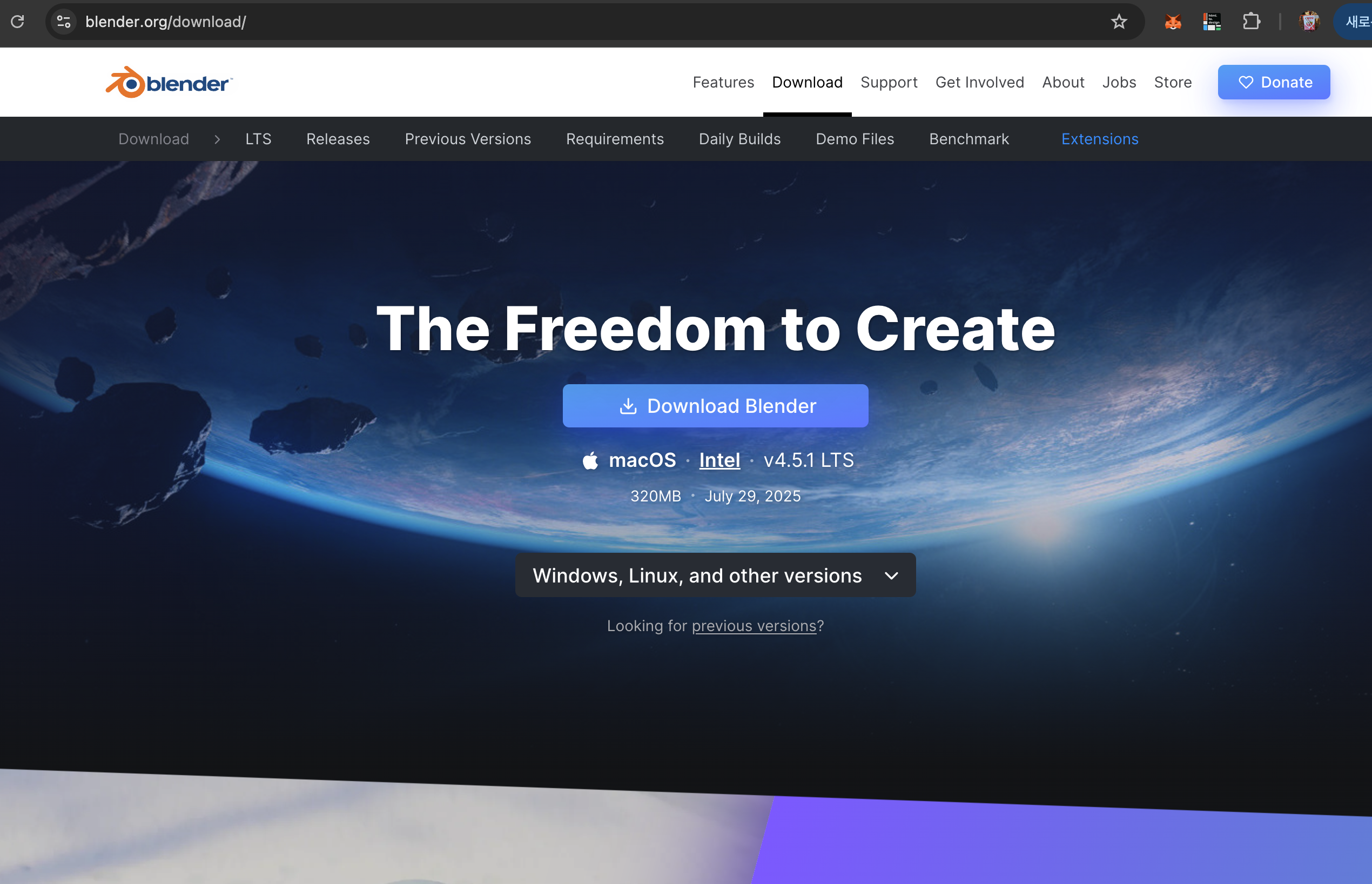 블렌더 공식 사이트에서 익스텐션 탭으로 이동
